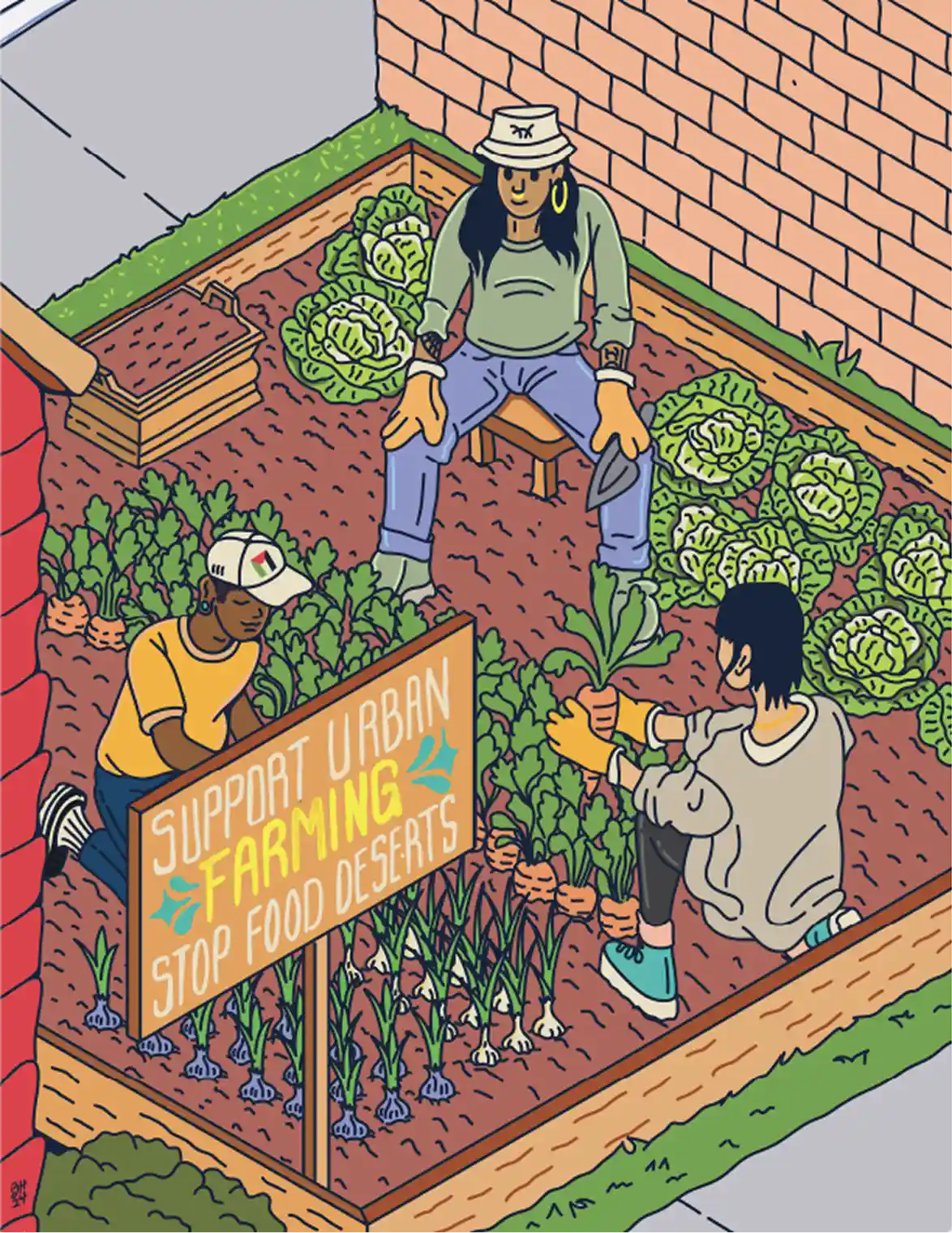 A future with anti-racist community development could center on accessibility in urban design, where walkable neighborhoods and abundant green spaces foster connection and health. Communities would thrive through easy access to essential resources, reducing systemic inequalities. Community-based gardens and urban farming initiatives would ensure that no area becomes a food desert, empowering residents to grow their own crops. This vision prioritizes equity, well-being, and sustainability, creating cities where everyone can flourish, regardless of race or background. Living in Chicago, I notice that a lot of people in low-income neighborhoods lack these spaces, I wanted to create something that resonates with residents in my city and beyond.