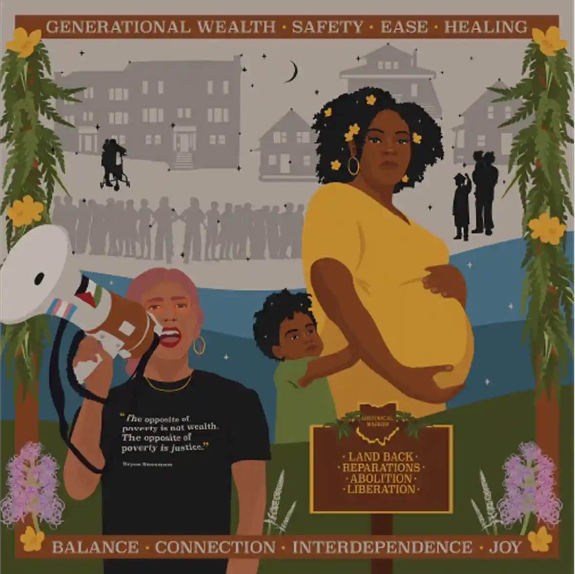 A person wearing a shirt that says, “The opposite of poverty is not wealth. The opposite of poverty is justice. – Bryan Stevenson,” holds a megaphone tagged with the Palestinian and trans flag stickers. To their right, there’s an Ohio historical marker that says “Land Back, Reparations, Abolition, and Liberation.” Behind them, a pregnant Black femme with flowers and stars in her hair holding her belly with their child hugging her from behind. In the sky are constellations and silhouettes of community members, empowered, active, and connected by shared power in front of different homes. Framing the image are flowers native to Ohio with the written values of generational wealth, safety, ease, healing, balance, connection, interdependence, and joy.